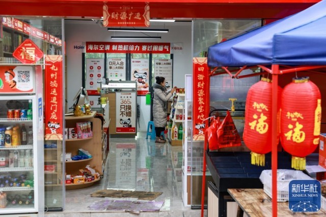 ↑团结村村民赵荷花在自家经营的超市内摆放货物(2月2日摄)。