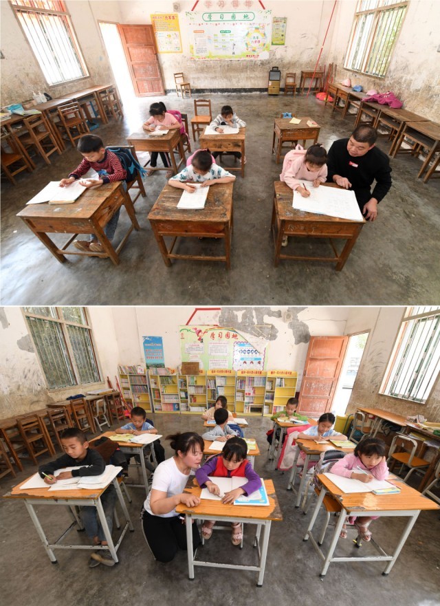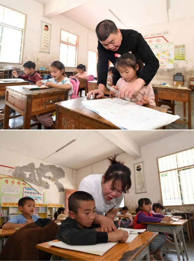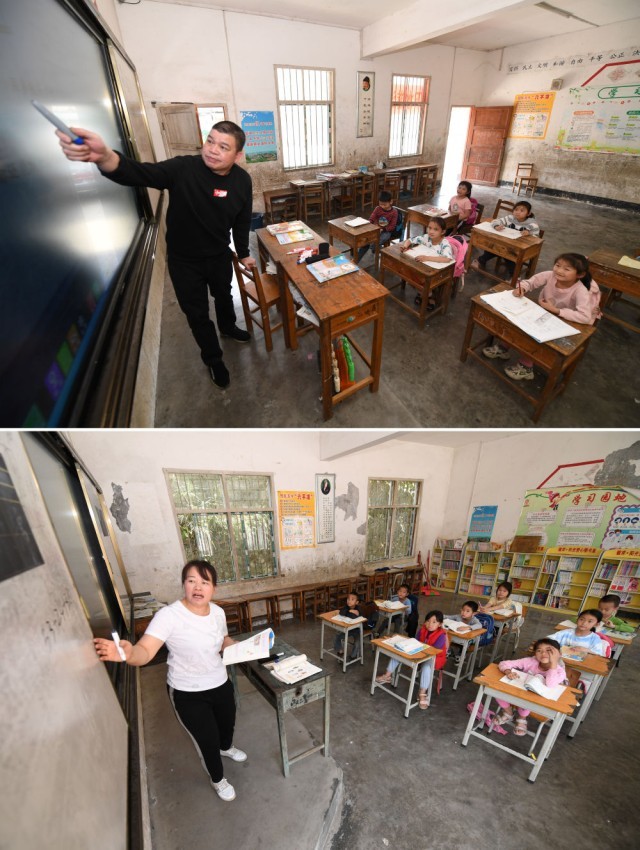 ↑这是一张拼版照片:在广西德保县东凌镇那王小学,黄永勇(上图)和黄秀碧(下图)在给学生上课(3月22日摄)。