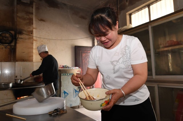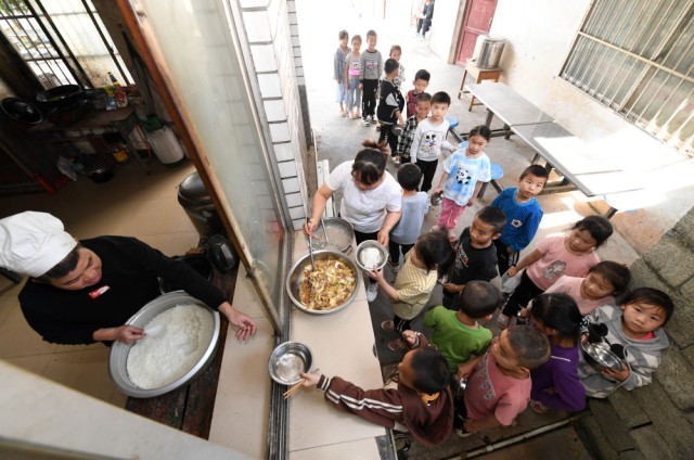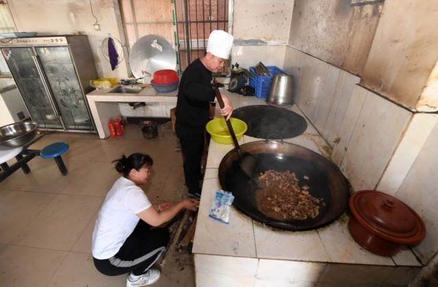 ↑在广西德保县东凌镇那王小学,黄秀碧(右)和黄永勇在给学生做午餐(3月22日摄)。