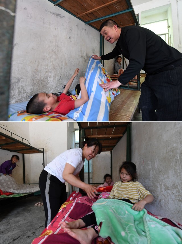 ↑这是一张拼版照片:在广西德保县东凌镇那王小学,黄永勇(上图)和黄秀碧(下图)在照顾学生午休(3月22日摄)。