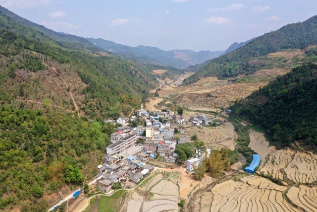 ↑这是广西德保县东凌镇那王小学所在的山村(3月22日摄,无人机照片)。