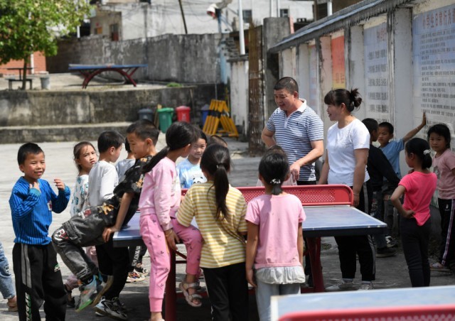 ↑在广西德保县东凌镇那王小学,黄永勇和黄秀碧课间和学生在一起(3月22日摄)。