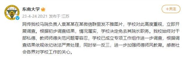 央视网消息:据东南大学,网传我校马院负责人袁某某在某微信群里发不雅图片,学校对此高度重视,立即开展调查。根据初步调查结果,情况属实,学校决定免去其院长职务。