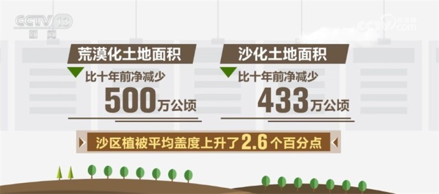 党的十八大以来,我国累计完成防沙治沙任务2033万公顷,53%的可治理沙化土地得到治理,荒漠化、沙化土地面积分别比十年前净减少500万公顷、433万公顷,沙区植被平均盖度上升了2.6个百分点。沙区生态状况“整体好转、改善加速”,荒漠生态系统“功能增强、稳中向好”。我国提前实现了联合国提出的到2030年实现土地退化零增长目标。