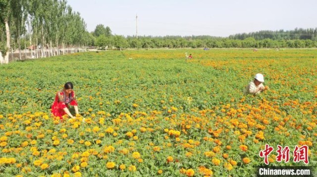 莎车县今年种植了10万亩万寿菊,万寿菊是一种特色经济作物,是提取纯天然黄色素的主要原料。 艾力 摄