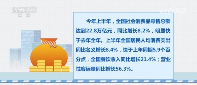 今年上半年,全国社会消费品零售总额达到22.8万亿元,同比增长8.2%,明显快于去年全年。上半年全国居民人均消费支出同比名义增长8.4%,快于上年同期5.9个百分点,全国餐饮收入同比增长21.4%;营业性客运量同比增长56.3%。