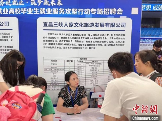 中新网武汉8月10日电(武一力 武海樱 曹妤)湖北省离校未就业高校毕业生就业服务攻坚行动专场招聘会10日在武汉市洪山体育馆启动。本次活动由湖北省人社厅联合省教育厅、省财政厅、省文旅厅、省国资委、省工商联共同举办,156家知名企业为高校毕业生提供岗位4100个。