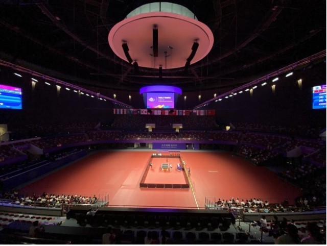图为杭州拱墅运河体育公园体育馆在进行模拟“乒乓球女子团体决赛”。新华社记者魏一骏摄