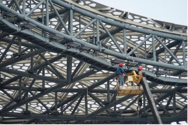 图为工作人员在绍兴柯桥羊山攀岩中心调整灯光布局。新华社记者林光耀摄