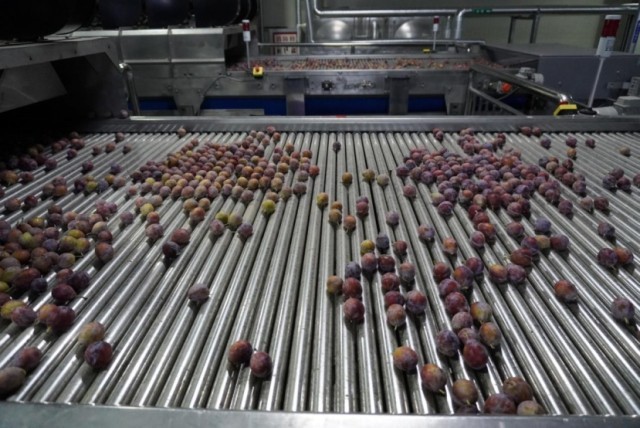 保鲜库里正在分拣的新梅。人民日报记者白阳摄