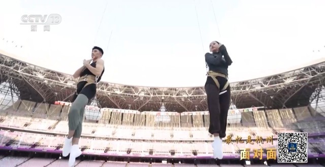 这是《钱塘潮涌》篇章中的双人3D威亚节目,展现了勇立潮头的波澜壮阔场景,这也是世界上首次在大型运动场空间中使用双3D威亚技术。