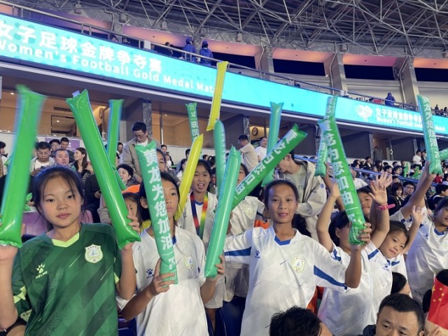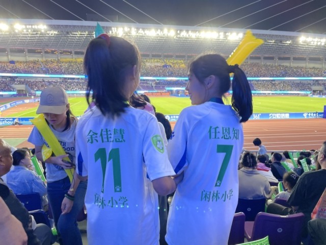 10月6日晚8时,杭州亚运会女足决赛在黄龙体育中心打响。在前来观战的球迷中,有一支特殊的队伍——15名来自杭州市余杭区闲林中心小学足球队的女生。她们身着蓝白相间的队服,背后印着自己的名字和号码。
