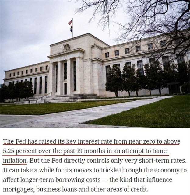 为了应对自己一手造成的高通胀,美联储在过去的19个月里连续加息,将基准利率从接近于零的水平上调至5.25%以上,为22年来的最高水平。