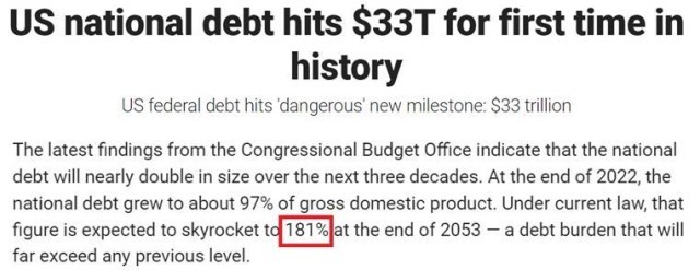△福克斯新闻报道:据美国国会预算办公室预测,美公共债务规模未来30年将增长近一倍,其与国内生产总值(GDP)的比率到2053年时,将从现在的97%飙升至181%。
