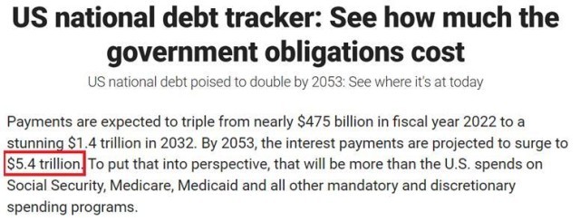 美国跨党派研究机构“负责任联邦预算委员会”的数据显示,美国国债的利息支出或将成为未来30年联邦预算中增长最快的部分。预计到2053年,债息支出将达到5.4万亿美元,超过美国在社保、医保等所有强制性和可自由支配支出项目上的支出。