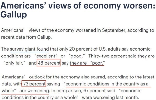 盖洛普咨询公司最新民调显示,9月有48%的受访者表示他们“很穷”,高于8月的42%;而认为经济状况“优秀”或“良好”的受访者为20%,比8月份下降了3个百分点。