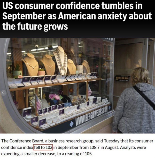 美国谘商会日前发布的数据显示,受通胀高企等因素影响,美国9月消费者信心指数由8月的108.7降至103,连续第二个月出现下降。