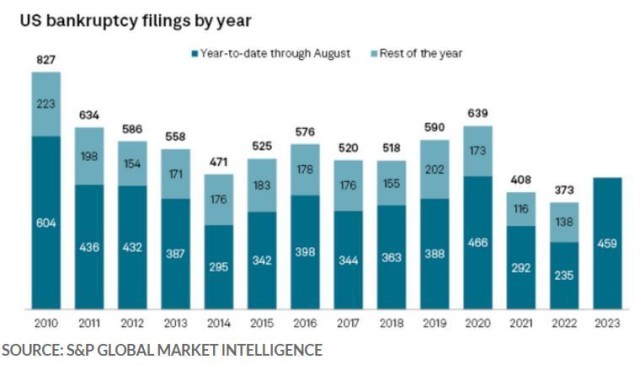 与此同时,根据金融分析公司标普全球公布的数据,受利率持续上升冲击,截至8月底,今年美国共有459家企业申请破产,其中资产额超过10亿美元的大企业有16家,创下2020年以来最高纪录。