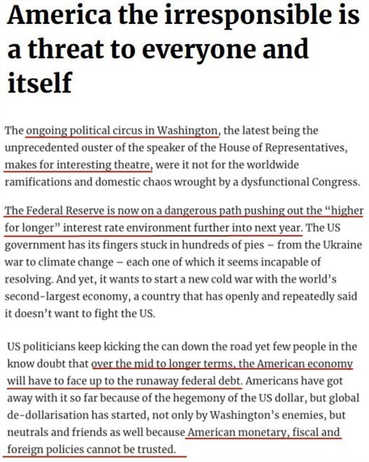 香港《南华早报》近日刊发评论文章说,美国相当自满,认为自己的经济表现不俗。但人们看到的却是华盛顿正在上演政治闹剧,美联储也正走在一条危险的道路上,将所谓“越高越好”的利率环境进一步推向明年。美国政客们一直在拖延问题,从中长期来看,美国经济将不得不直面失控的联邦债务。“美国的货币、财政和外交政策已经不再被多数国家信任。”