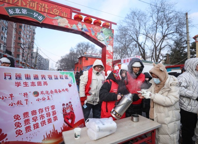 2024年1月21日,在辽宁沈阳小河沿早市,志愿者为游客提供免费热水。新华社记者 龙雷 摄
