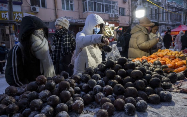 2024年1月22日,在黑龙江哈尔滨红专街早市,游客挑选冻梨和冻柿子。新华社记者 才扬 摄