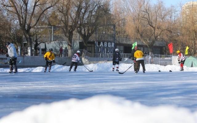 2024年1月7日,冰球爱好者在辽宁省沈阳市劳动公园人工湖上打冰球。新华社记者 陈为 摄