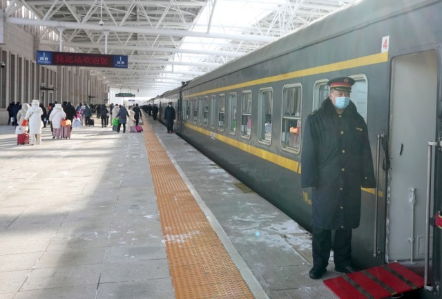 1月23日,K7065次列车到达终点抚远站,列车员在车门立岗作业,组织旅客下车。