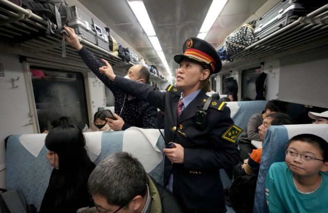 1月22日晚,在哈尔滨开至抚远的K7065次列车上,牡丹江客运段列车长徐丹在硬座车厢进行安全检查。