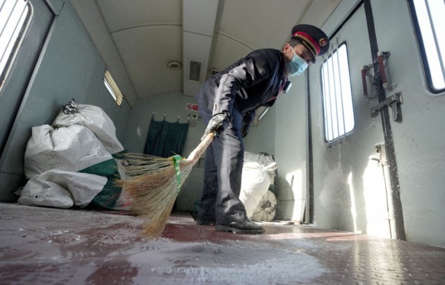 1月23日,在哈尔滨开至抚远的K7065次列车上,行李员赵明君打扫行李车厢地板上的雪。