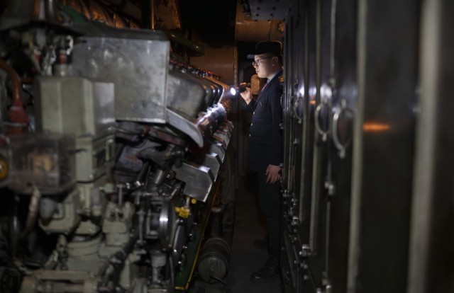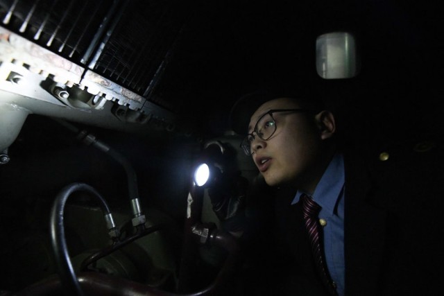 1月23日凌晨,在哈尔滨开至抚远的K7065次列车上,机车副司机徐瑞南在机械间巡检。