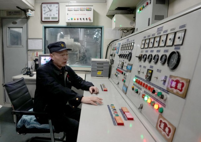 1月22日晚,在哈尔滨开至抚远的K7065次列车上,发电车乘务员龚雪东查看各发电机组功率、水温等状态,保证列车正常供电。