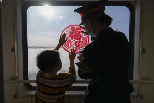1月23日,在哈尔滨开至抚远的K7065次列车上,列车员与一名小乘客贴“福”字窗花。