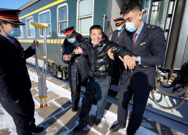 1月23日,在黑龙江省佳木斯市洪河站,乘务员搀扶一位在哈尔滨刚做完手术返回家乡的男子下车。