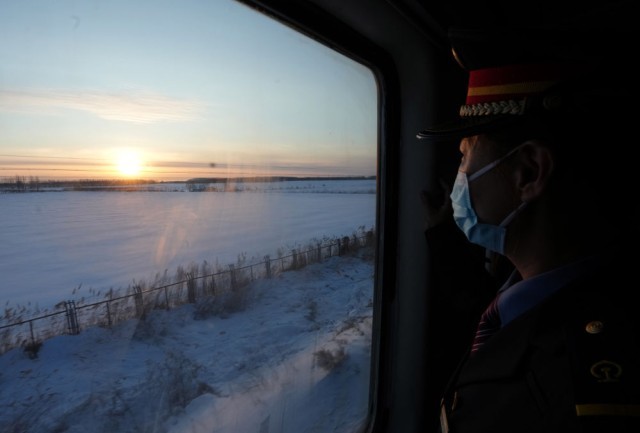 1月23日,在哈尔滨开至抚远的K7065次列车上,通宵值班的列车员迎接日出。