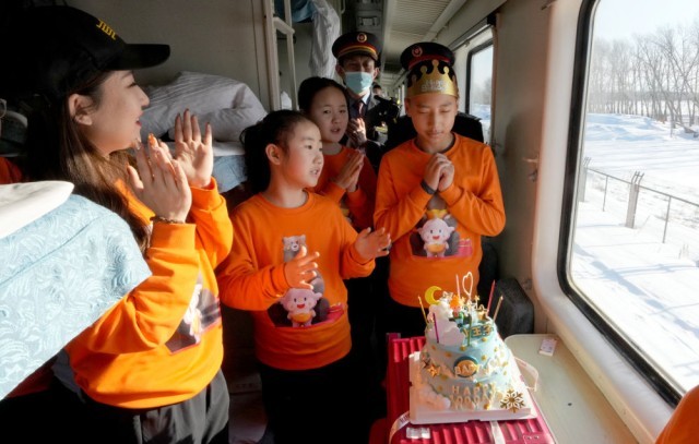 1月23日,在哈尔滨开至抚远的K7065次列车上,列车员和老师为12岁的学生吕翔宇举办生日宴会。孩子们刚从广西游学归来。