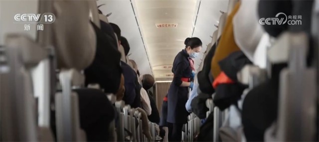 中国东航C919客机乘务长 张雯婧:我们非常特别的一点,就是经济舱的三连排的座位要比其他飞机的中间座位更宽一点,宽1.5厘米。