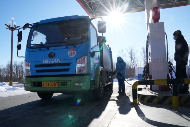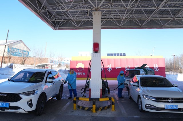 2月2日,中石油黑龙江抚远东方第一加油站的员工给车辆加油。