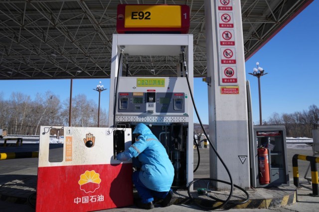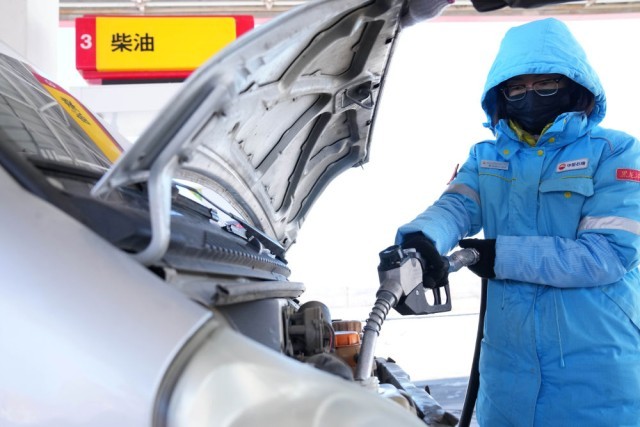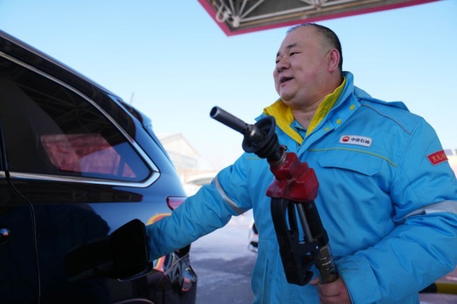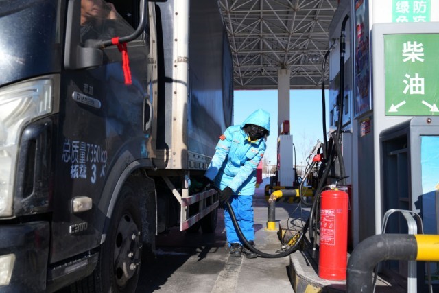 2月2日,中石油黑龙江抚远东方第一加油站加油员肖洋灵在给车辆加油。