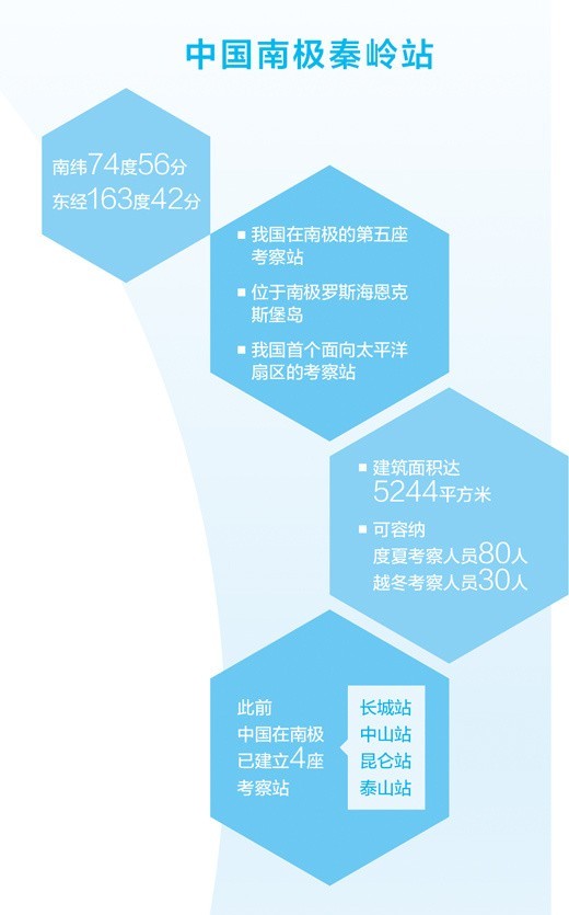 秦岭站建筑面积达到5244平方米,可容纳度夏考察人员80人,越冬考察人员30人。这座新站的主体设计为南十字星造型,设计理念源自中国航海家郑和下西洋使用的南十字星导航。据了解,这是我国继长城站、中山站之后第三个常年考察站,也是首个面向太平洋扇区的考察站。