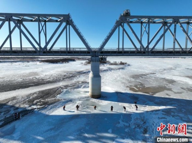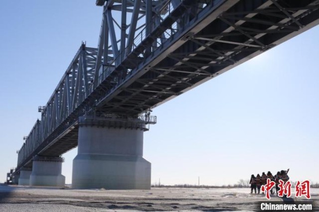 同江中俄黑龙江铁路大桥在2022年11月份正式通车,是首座横跨中俄两国界江黑龙江的铁路桥。大桥主桥长2215米,处于中方境内的有1886米。每年冬天,巡检班组都要对中国境内的桥梁进行勘测。