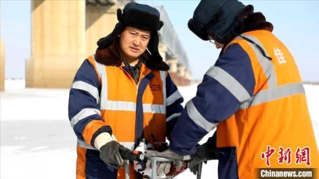 “每年我们都得对这个桥进行测量,测量它的数据,然后回去合成,看看这个桥墩有没有变化,有没有偏斜度等。”佳木斯工务段路桥车间班长姜传扬说。迎着刺骨的江风,他和工友们手持钻冰机,螺旋形的冰刀卷起的冰碴四处飞溅。连续凿了几个冰洞。