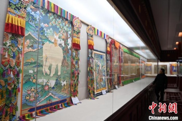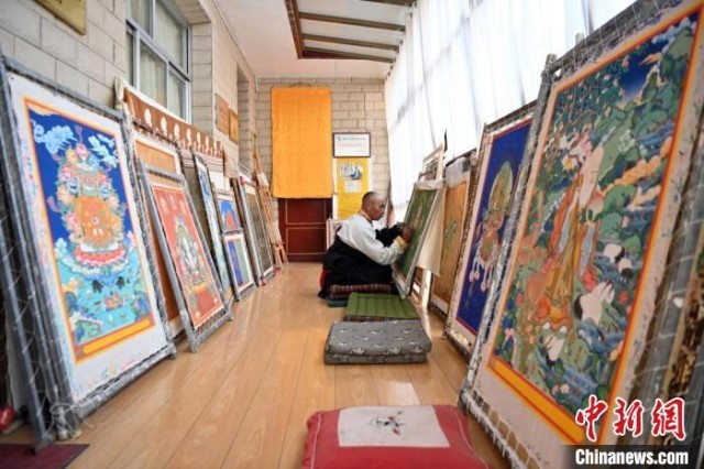 精品唐卡展厅展示甘南藏族唐卡国家级代表性传承人交巴加布,及其父亲的唐卡作品,常吸引游人“打卡”。(资料图)中新社记者 九美旦增 摄