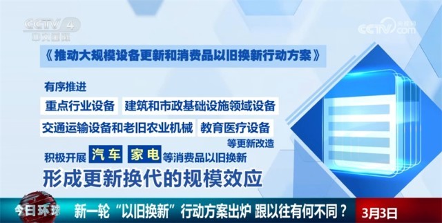 央视网消息:日前,国务院常务会议审议通过了《推动大规模设备更新和消费品以旧换新行动方案》。行动方案有哪些亮点?新一轮“以旧换新”和以往有什么不同?来看专家的解读。