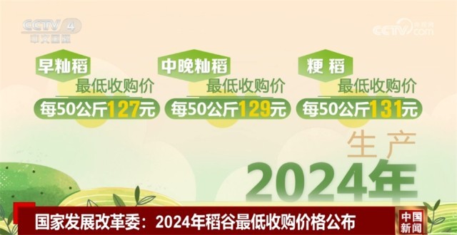 记者从国家发展改革委了解到,经国务院批准,今年国家继续在稻谷主产区实行最低收购价政策,2024年生产的早籼稻(三等)、中晚籼稻和粳稻最低收购价分别为每50公斤127元、129元和131元。限定2024年最低收购价稻谷收购总量为5000万吨,其中籼稻2000万吨、粳稻3000万吨。