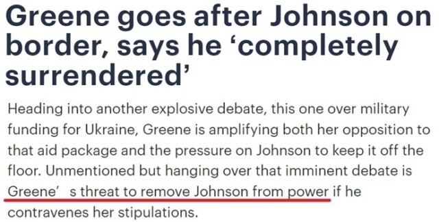 在另一场关于向乌克兰提供军事资金的激烈辩论中,格林加大了她对该援助计划的反对力度,并向约翰逊施压,要求他不要将其列入讨论范围。格林威胁说,如果约翰逊违反她的要求,她将把他赶下台。