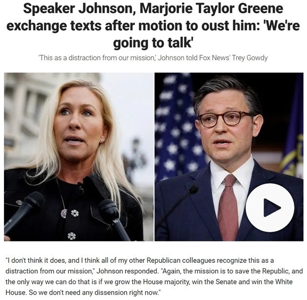 在约翰逊担任众议院议长的短暂时间里,格林几乎一直在批评他。在约翰逊与拜登就支出协议进行谈判后,她在上个月底加大了批评力度。就在本次国会休会前,格林甚至提出了罢免约翰逊的决议。