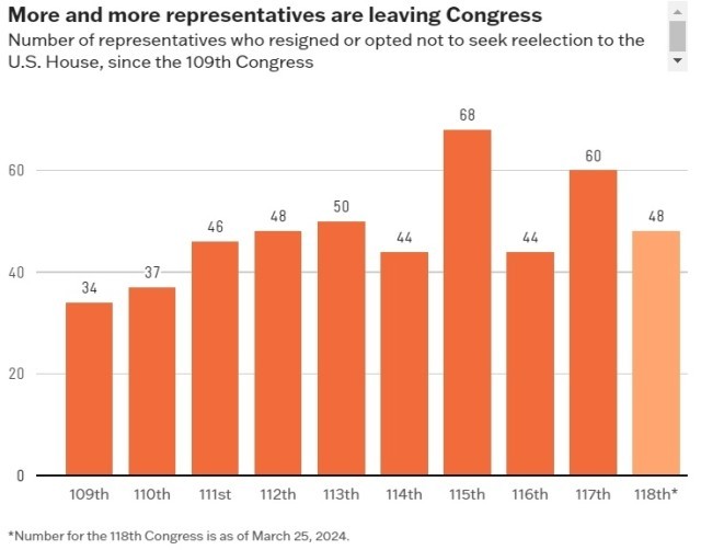 自第109届国会(2005- 2006年)以来,自愿离开众议院的众议员人数一直呈上升趋势。有分析称,如果年内再有3名议员宣布离职计划,本届国会将是过去20年来离职人数第三多的国会。