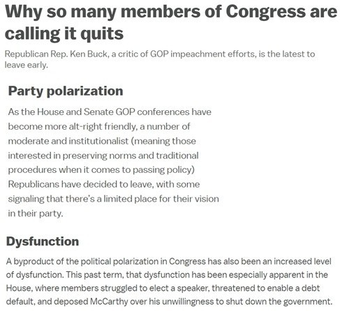 国会政治两极分化加剧了国会功能失调。在上一届任期内,议员们艰难地选举众议长,威胁要使债务违约成为可能,并因麦卡锡不愿关闭政府而罢免了他……沮丧加上两极分化导致了一个越来越有害的环境,双方成员互相谩骂,使用程序性策略相互惩罚、争吵甚至欺凌。