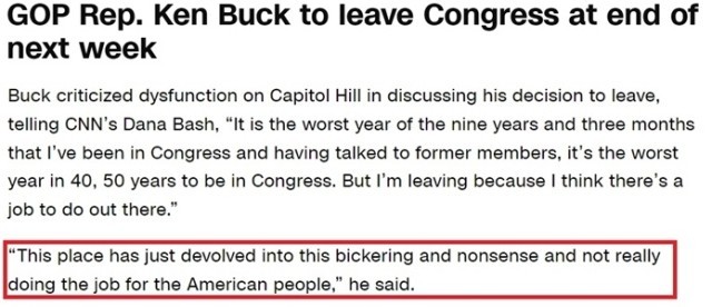 时任众议员肯 巴克对辞职的原因直言不讳,“这是我在国会任职9年零3个月以来最糟糕的一年”,“还是美国国会近四五十年来最糟糕的一年”,“这个地方已经变成了争吵和胡说八道的地方,没有真正为美国人民服务”。