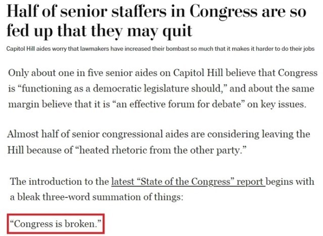 美国沃克斯新闻网评论称,国会议员退出的主要原因就是党派极化:多位即将退休的议员称,从难以通过重大立法到琐碎的内斗,国会整体功能失调是他们离职的主要原因。